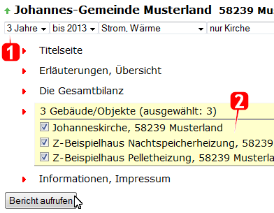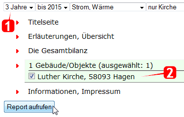 - Für den Energiebericht können Sie Zeitraum, Berichtssektoren, Nutzungsarten und betrachtete Objekte auswählen.