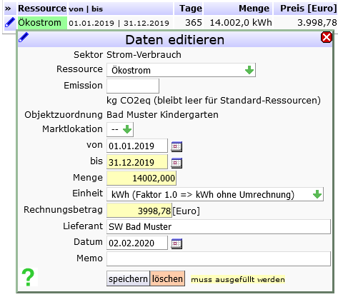 - Rechnungsdaten (und Bezugsdaten) sind die Grundlage von Kennzahlen-Tabelle und Bilanz-Diagrammen. Pro Sektor, Ressource und Verbrauchsjahr können Sie mehrere Rechnungen eingeben. Die Aufsummierung erfolgt nach dem Jahr des Feldes ´bis´.