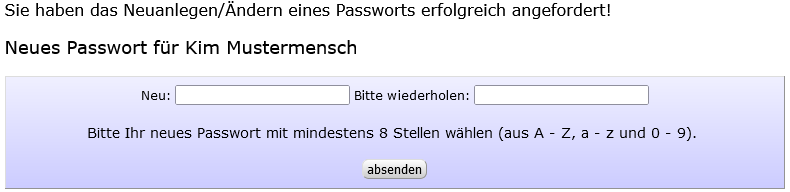 - Nach Anklicken der Schaltfläche ´Bestätigungsmail für neues Passwort anfordern´ erhalten Sie dann auf diese Adresse eine Bestätigungsmail mit einem Aktivierungslink (24 Stunden gültig). Mit Anklicken des Links gelangen Sie (in einem neuen Browserfenster) zur Eingabe Ihres Passwortes.