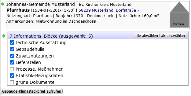 - Mit dem Gebäude-Klimasteckbrief können Sie aus sieben Informations-Blöcken auswählen, welche Angaben gebäude- bzw. objektbezogen als Steckbrief wiedergegeben werden sollen.