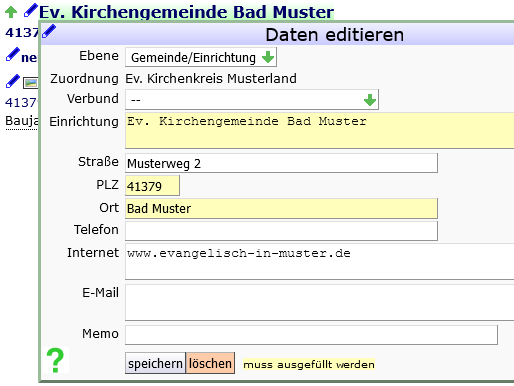 - Die Grunddaten Ihrer Gemeinde/Einrichtung ändern Sie über diese Bearbeitungsmaske. Für jede vollständige Adresse steht anschließend ein Link zu Open Streetmap zur Verfügung.