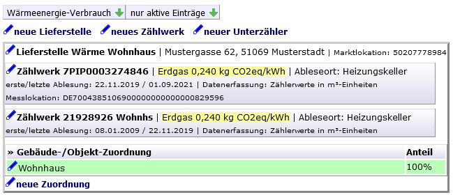 - Sie können einen Zähler mehreren Gebäuden zuordnen, z.B. zu Gebäude A mit 0,4 bzw. 40% und zu Gebäude B mit 0,6 bzw. 60%.