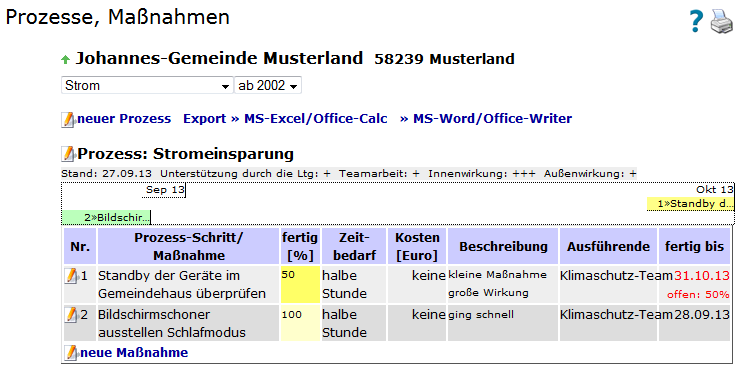- In „Prozesse, Maßnahmen“ dokumentieren Sie Ihre Ziele und Maßnahmen, Aufwand und zuständige Akteure sowie den zeitlichen Verlauf der Realisierung.